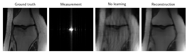 pd.DataFrame.from_dict(results, orient="index", columns=("PSNR", "PSNR no learning")).sort_values('PSNR', ascending=False).round(3).transpose()| sup | mo-ei | diffeo-ei | moi | ei | mc | ssdu | noise2inverse | |