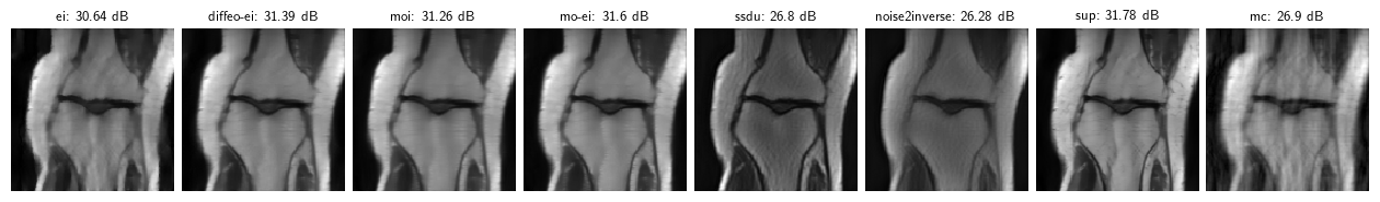 Note: these results are for a toy problem on 128x128 images trained for 50 epochs. For full benchmark results on full datasets see the paper “Benchmarking Self-Supervised Methods for Accelerated MRI Reconstruction”.